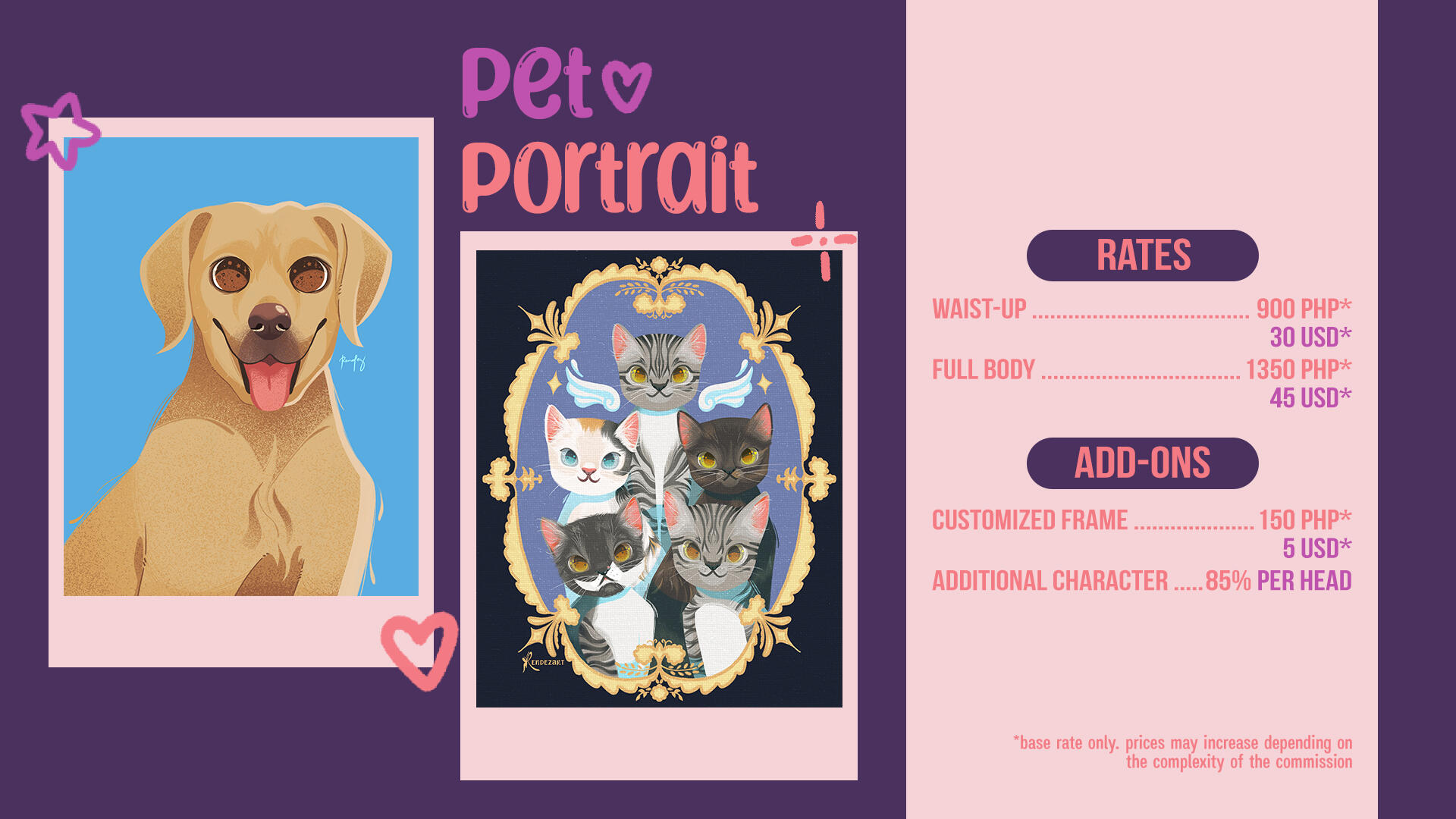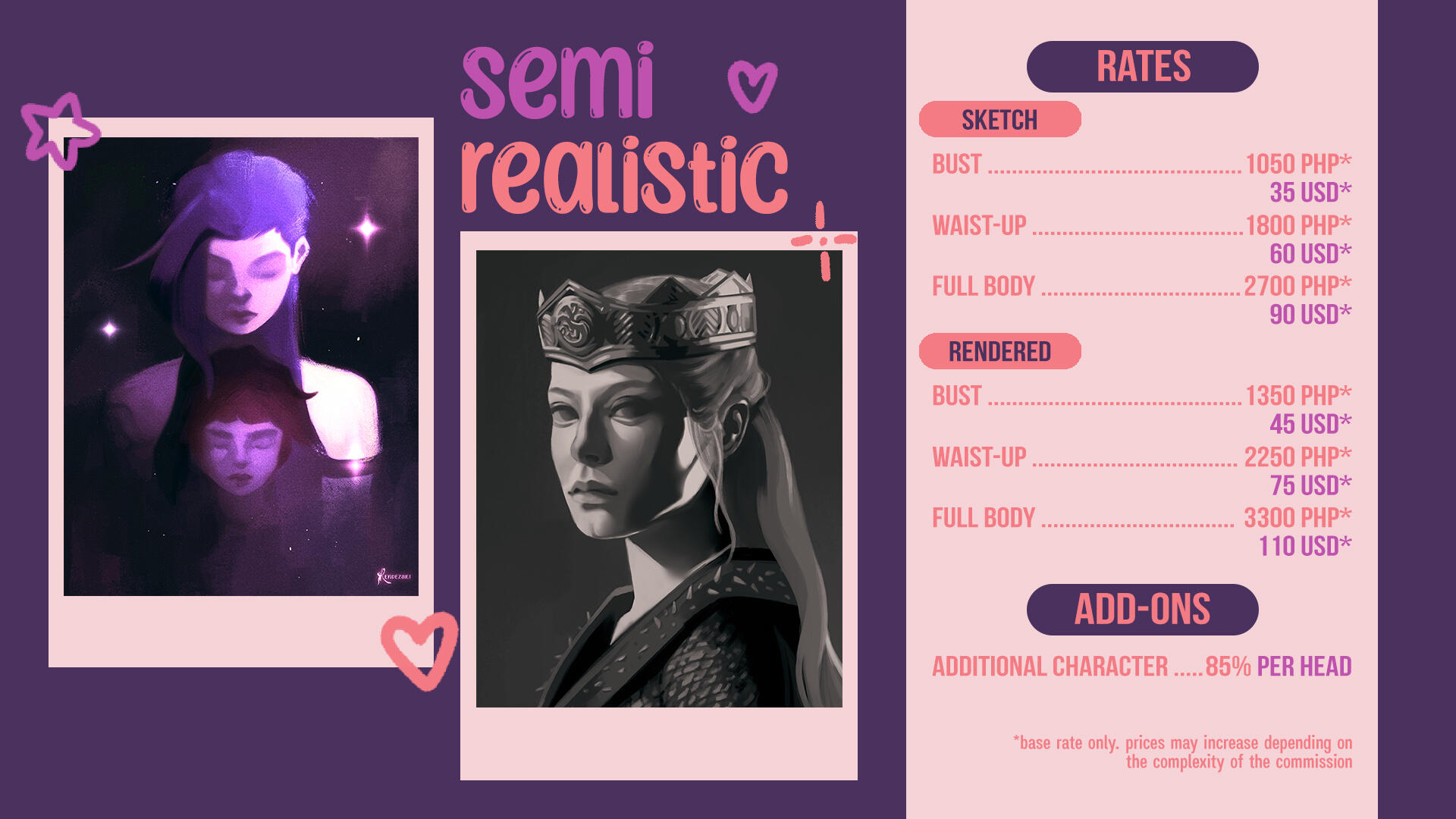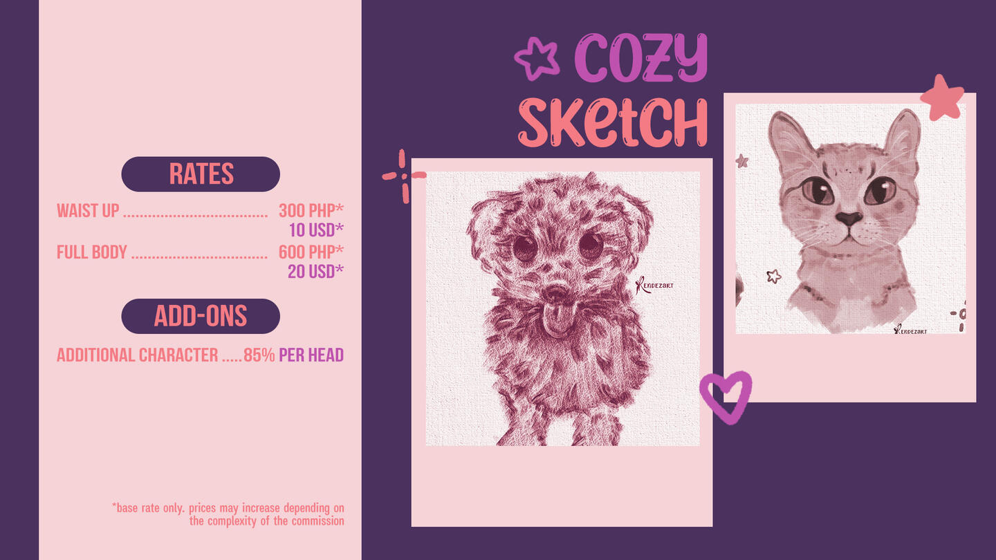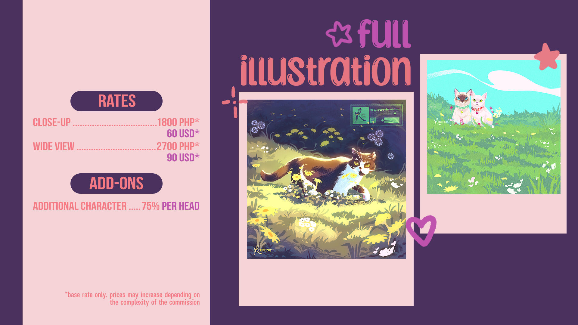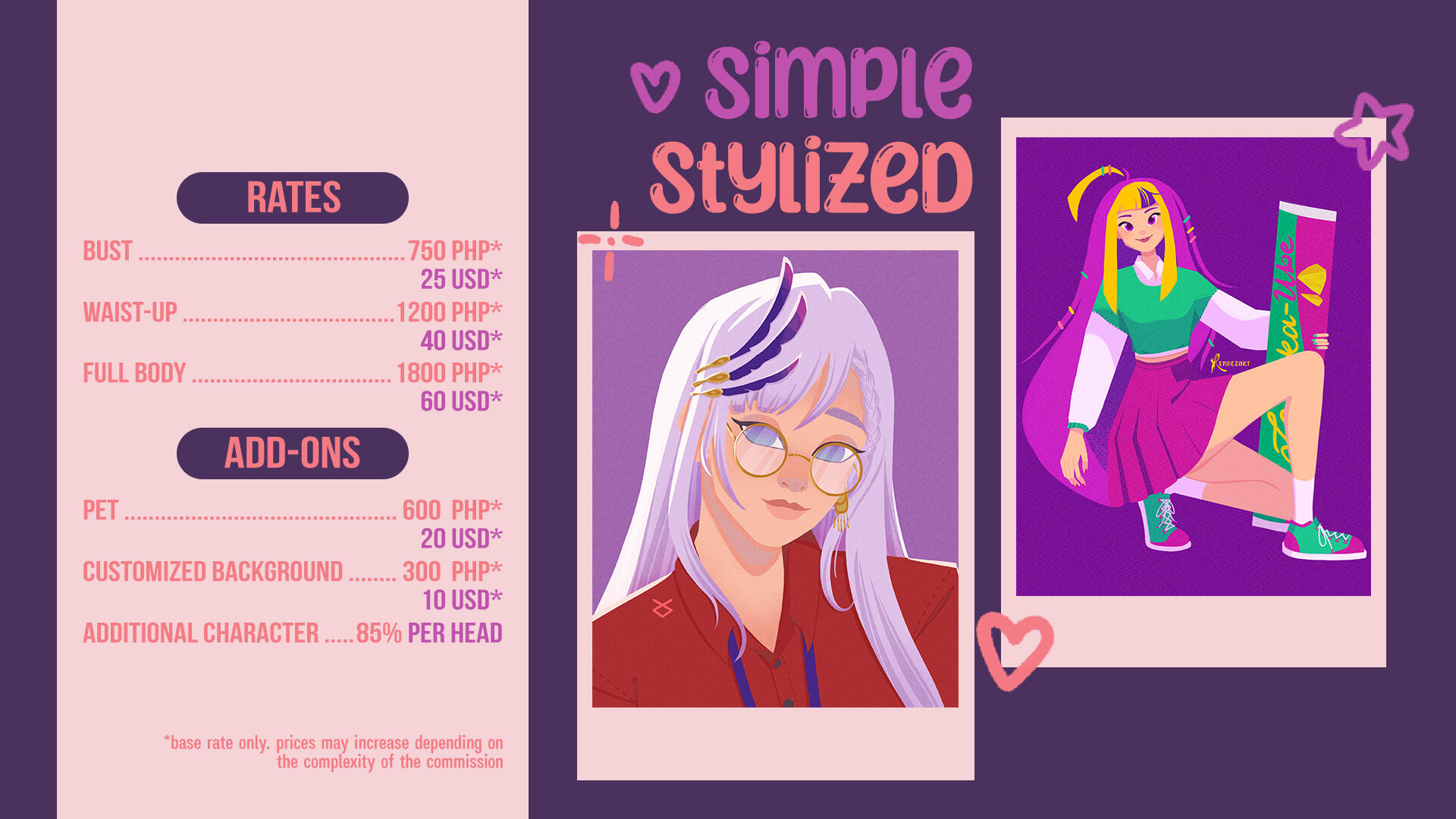 The prices listed on the commission sheet serve as base prices and are subject to change based on the complexity of the artwork. Factors such as design intricacy, accessories, outfits, and poses may contribute to the final commission price.